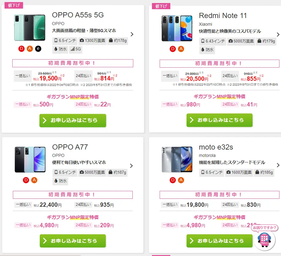 | moto g32 | ¥22,980 | ¥4,980 | ¥1,100 | ¥1,100 |